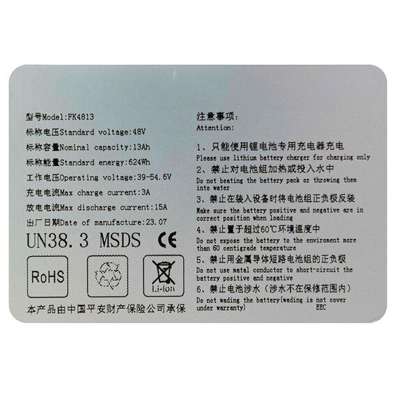 Hergestellt aus neuen EVE-Markenzellen, deren Qualität der Originalbatterie dieser Roller überlegen ist. Batterieeigenschaften: -Tatsächliche Kapazität: 13A/h (Test durchgeführt bei 20A mit Abschaltung bei 39V). -Nennspannung: 48V. -Maximale Spannung: 54,6. -Zellzusammensetzung: 10S6P. -Zellmodell: Lí-ON icr18650 3100mA/h [EVE]. -Empfohlene maximale Entladung: 40 A. -Dauerentladung: 25 A. -Empfohlene maximale Ladung: 3 A. -Ladeanschluss: 2 x Dean Typ T weiblich. -Entladeanschluss: XT60 Stecker. -Inklusive Feuchtigkeitsetikett: Ja. BMS-Eigenschaften: -Ladung: 1-5 A. -Entladung: 40 A. -Zellensperrspannung: 2,8 V. -Typ: Separater Ladeanschluss ohne Kommunikation. -6 Monate Garantie, Bedingungen siehe unten.