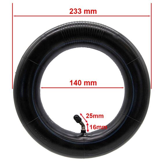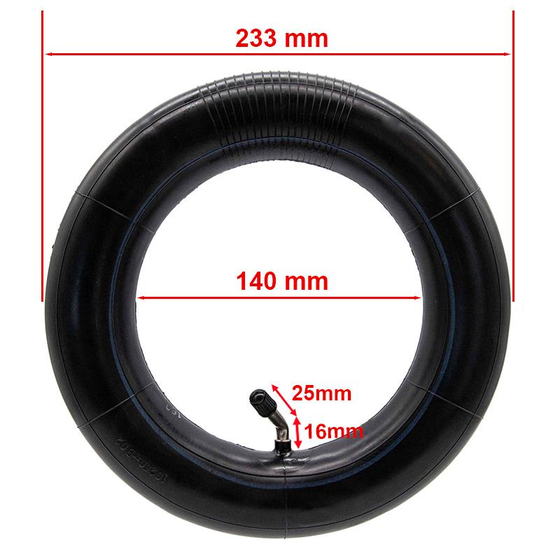 Maße: 10 x 2,5 Zoll. Mit gebogenem Ventil 135 x 45°. Entwickelt für optimale und langlebige Leistung, wodurch der Wartungsaufwand für den Roller reduziert wird. Der empfohlene maximale Druck des Schlauchs beträgt 4 kg, und es wird der vom Reifen vorgegebene Druck empfohlen: zwischen 2,8 und 3,5 kg.